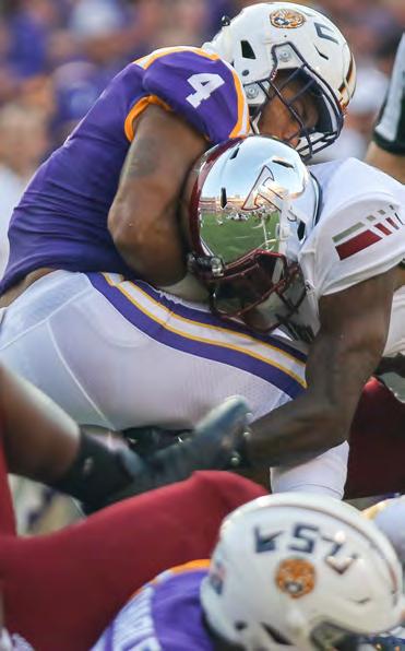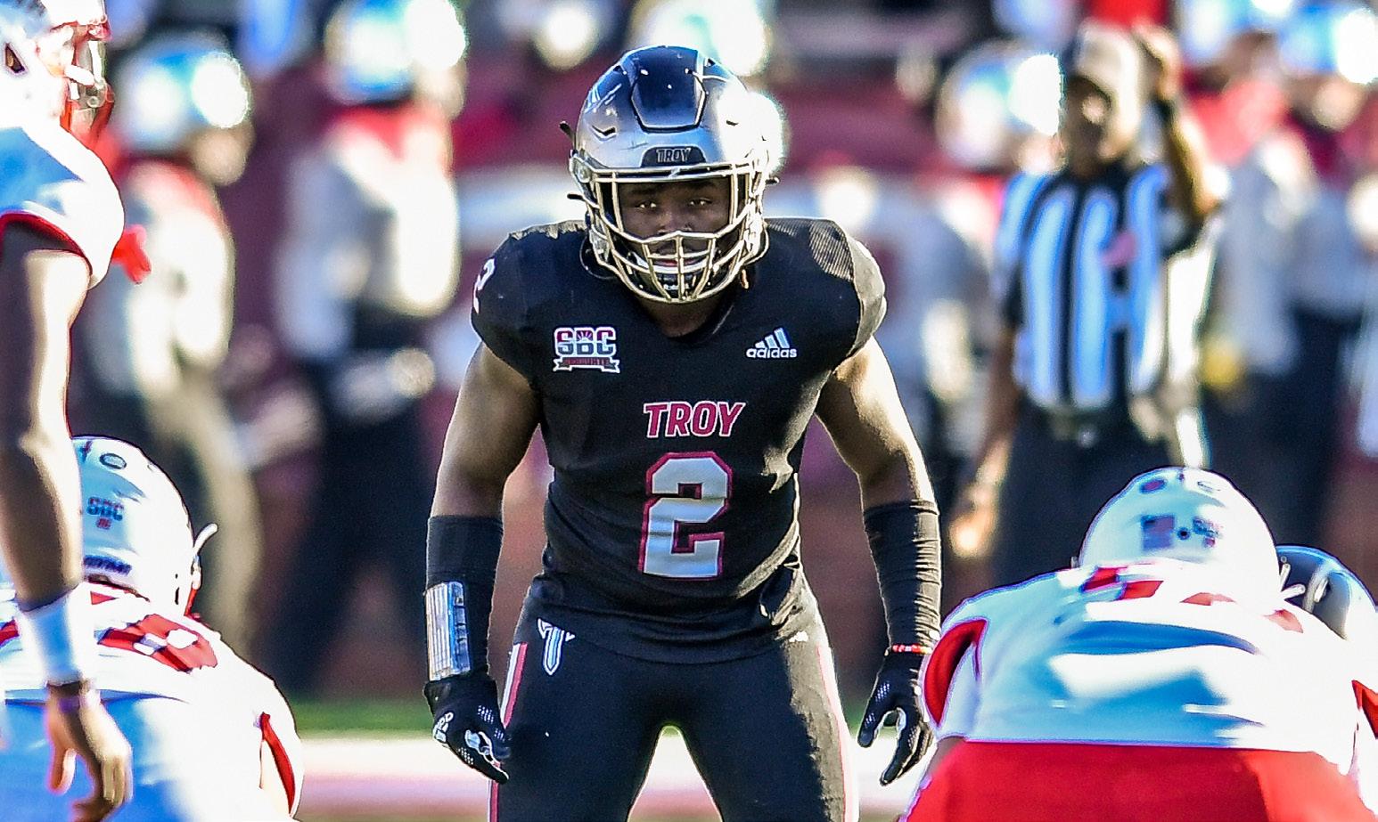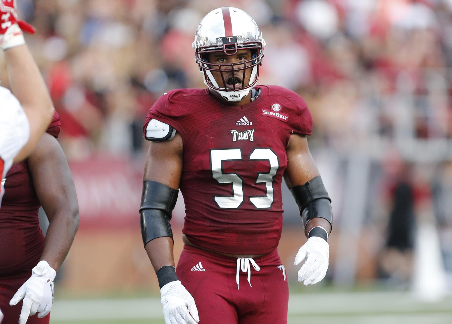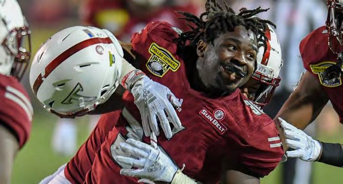 Carlton Martial celebrates one of his two forced fumbles as Troy defeated Buffalo in the 2018 Dollar General Bowl for its third bowl win in as many years and its fourth straight overall.