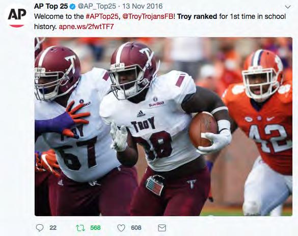 Troy became the first team in Sun Belt history to earn a Top 25 ranking in either the AP or Coaches Poll when the Trojans debuted at No. 25 in 2016.