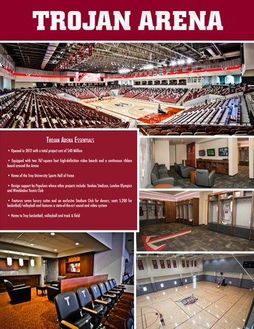 Trojan Arena Essentials • Opened in 2012 with a total project cost of $40 Million • Equipped with two 767-square foot high-definition video boards and a continuous ribbon board around the Arena • Home of the Troy University Sports Hall of Fame • Design support by Populous whose other projects include: Yankee Stadium, London Olympics and Wimbledon Tennis Club • Features seven luxury suites and an exclusive Stadium Club for donors; seats 5,200 for basketball/volleyball and features a state-of-the-art sound and video system • Home to Troy basketball, volleyball and track & field
