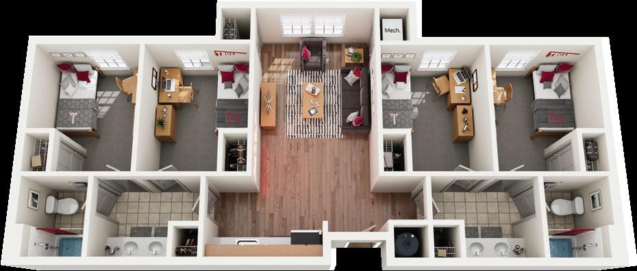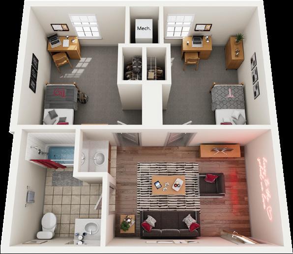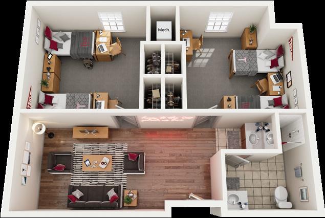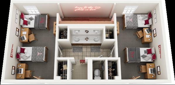 • Quad-style suites are designed to accommodate four students and feature two bedrooms with a shared bathroom.