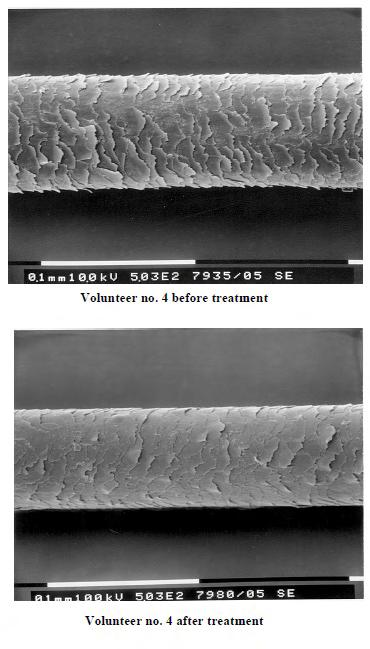 These assessments were confirmed by the examination of the hair under scanning electron microscopy which resulted for 8 subjects in an improvement in the appearance of the hair, observed by a more regular arrangement of the scales, and their closing against the capillary stem.