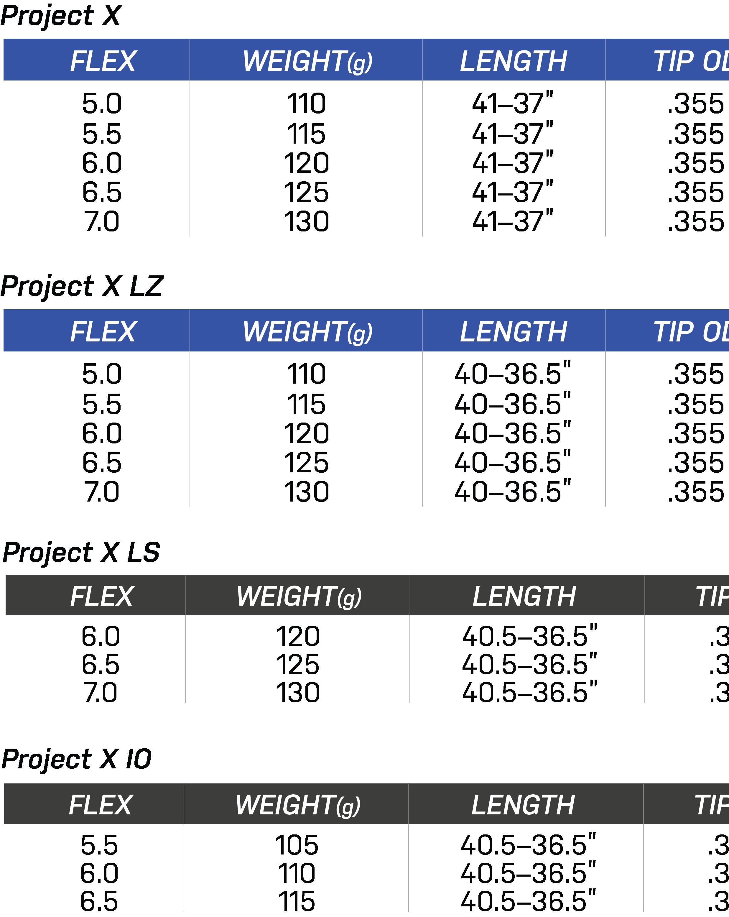 Project X LS BUTT OD LAUNCH LENGTH WEIGHT(g) TIP OD FLEX SPIN Project X IO .600 Low 40.5–36.5” 120 .355 6.0 .600 Low 40.5–36.5” 125 .355 6.5 .600 Low 40.5–36.5” 130 .355 7.0 Low Low Low BUTT OD LAUNCH LENGTH WEIGHT(g) TIP OD FLEX SPIN .600 Mid–High 40.5–36.5” 105 .355 5.5 .600 Mid 40.5–36.5” 110 .355 6.0 .600 Mid–Low 40.5–36.5” 115 .355 6.5 Mid–High Mid Mid–Low