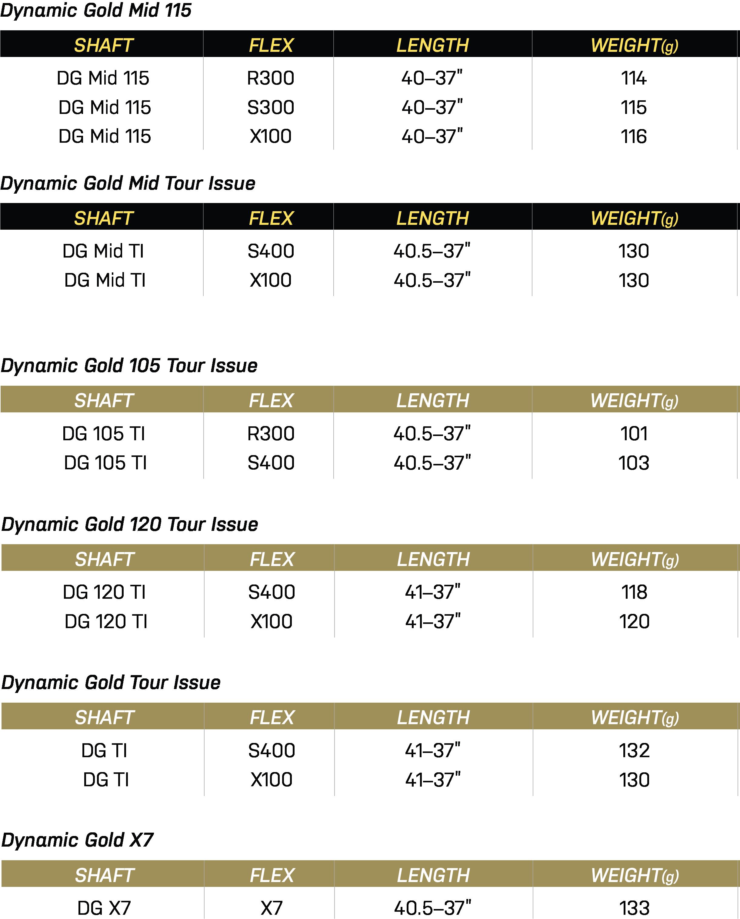 Designed to increase launch and spin compared to Dynamic Gold of similar weight Wider midsection diameter with unique multi–taper rate tip section increases launch while maintaining extremely stable feel Still provides trusted Dynamic Gold precision Tour Issue shafts hold ultra-tight weight tolerance