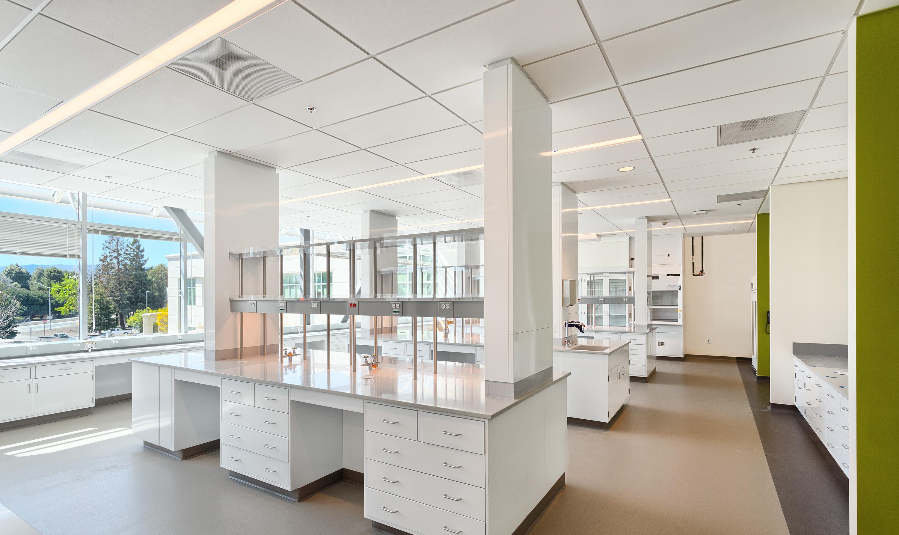 Occupying space in the Stanford Research Park, this project includes the demolition of an existing two-story office space and the creation of a state-ofthe-art life science research lab facility. This facility consists of private and shared office spaces adjacent to the labs, which take up 60% of the building. The labs include cell and tissue culture rooms, cold rooms, lab support space, and a vivarium. This project also includes exterior site upgrades to increase privacy and maximize green space, a full-service kitchen, and the installation of a new service elevator.