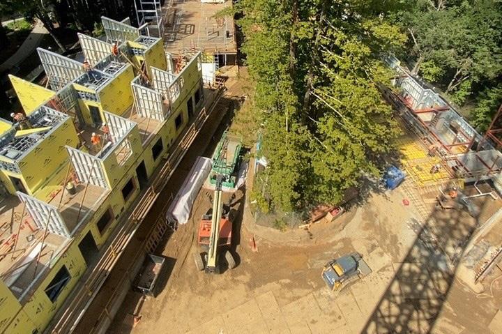 The redevelopment includes eight new dormitories, utilizing modular construction, with 585 beds, new Town Hall building, the renovation and refresh of five academic buildings, and demolition of 10 structures. The eight new residential halls consist of mass timber and steel structures, with Kresge L being the tallest at six stories. The advantages of mass timber prefabrication are leveraged to provide schedule and cost savings and improved carbon impacts. The project also includes extensive sitework.