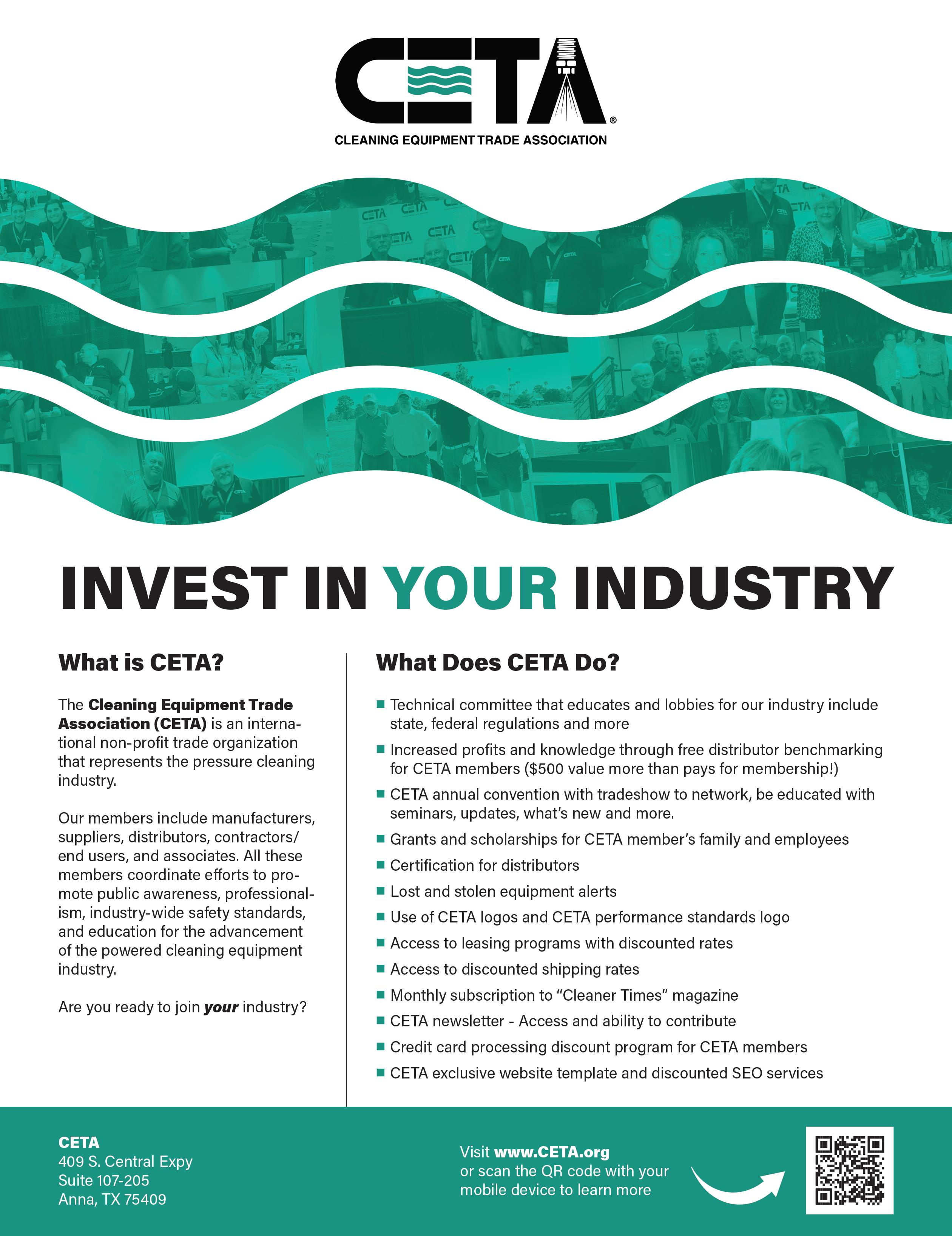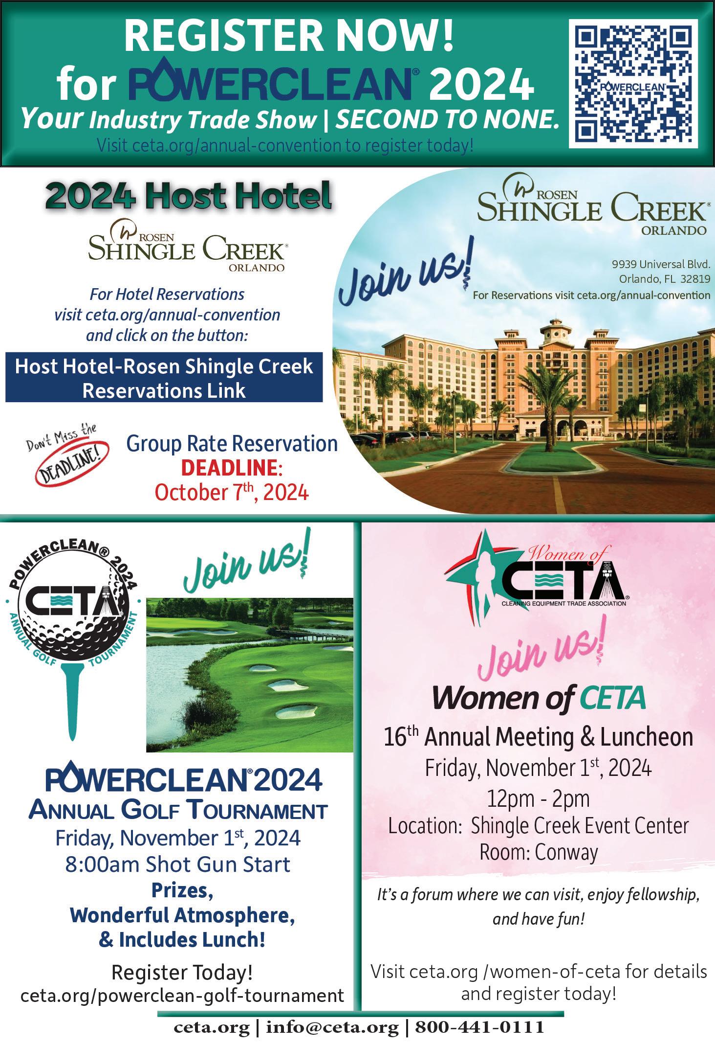 Don’t forget to mark your calendars for the October 31–November 3 PowerClean trade show in Orlando, FL. It will take place at the Rosen Shingle Creek Hotel. Keep your eyes peeled for the schedule and program in the October issue of Cleaner Times. We look forward to seeing you in Orlando.