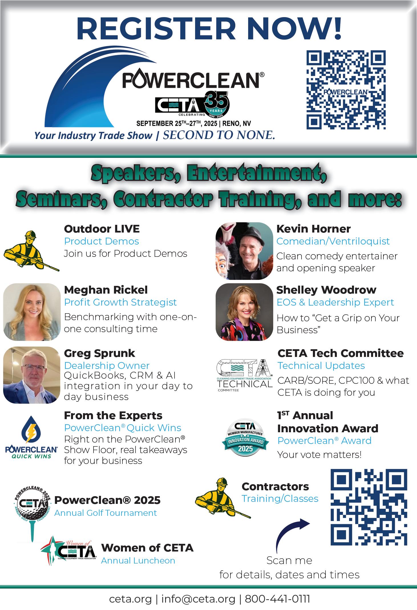 This year the Cleaning Equipment Trade Association (CETA) will celebrate its 35th anniversary at PowerClean 2025 in Reno, Nevada, at the Peppermill Resort Spa Casino from September 25–27. Make sure to plan to attend and find out more information by visiting CETA.org/annual-convention/.