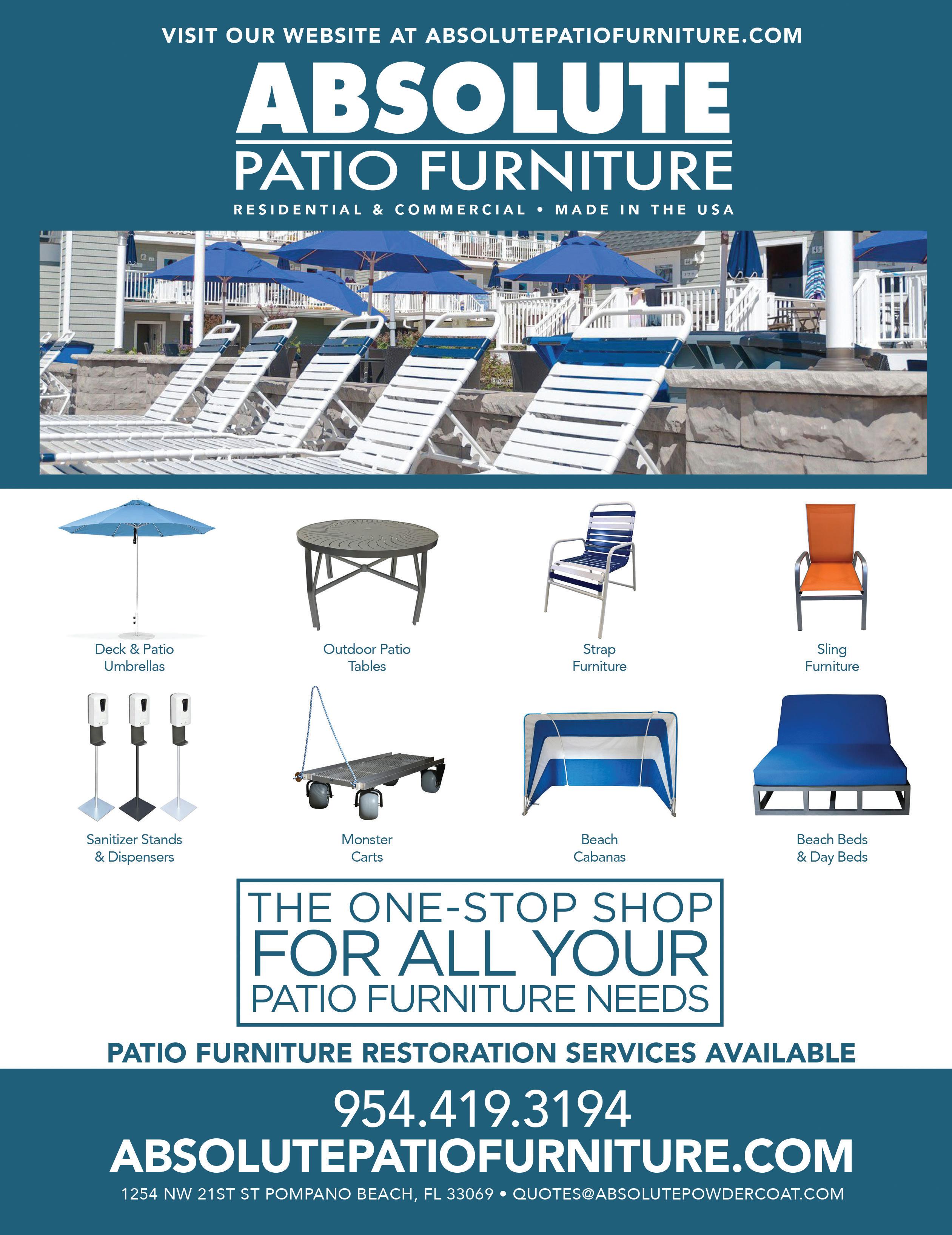 Absolute Patio Furniture has proudly served South Florida and the Caribbean for 35-plus years. Our customer base includes commercial and residential properties (homes, apartment complexes, condominium communi-