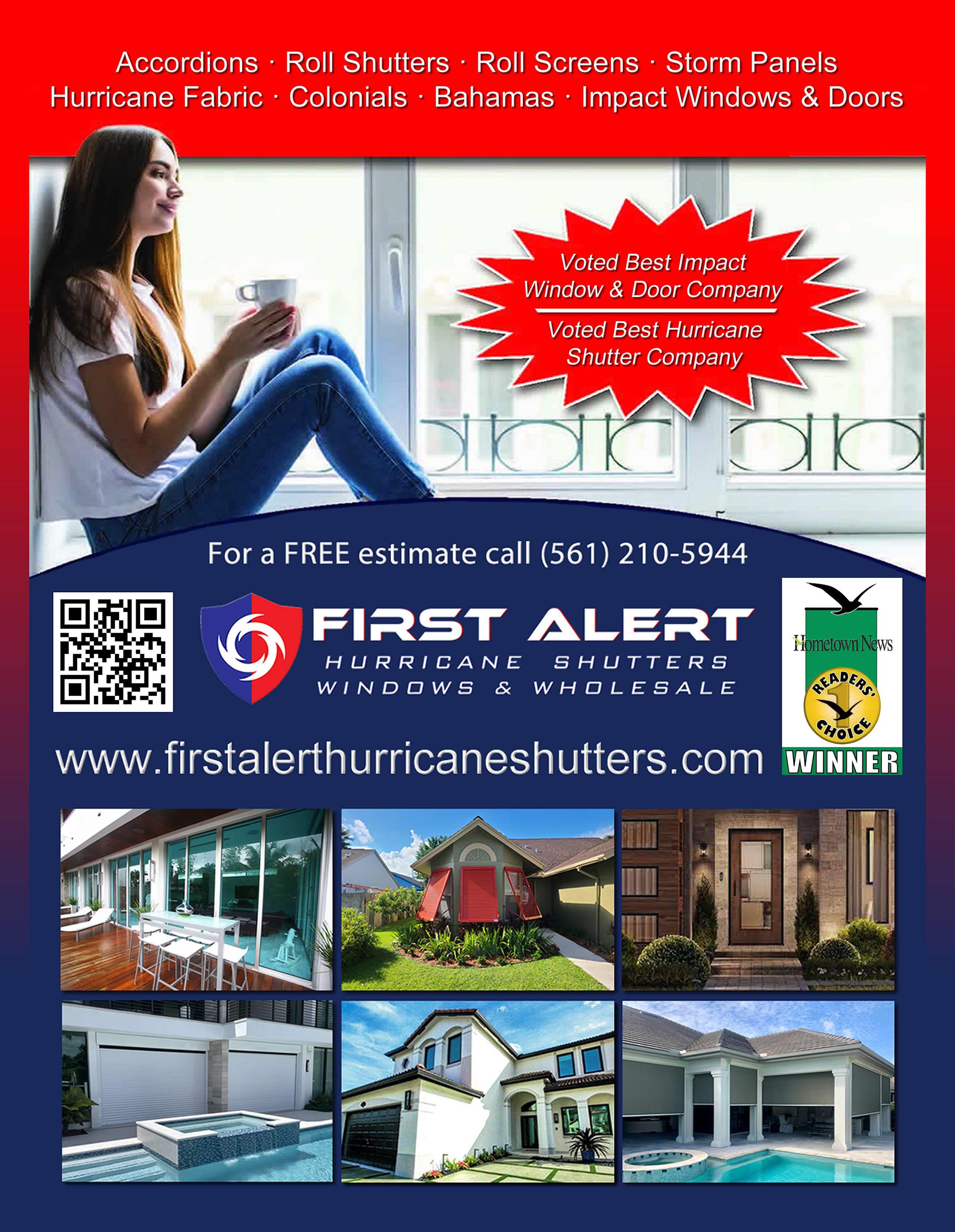 AND SHUTTERS First Alert: 561-210-5944; www. firstalerthurricaneshutters.com