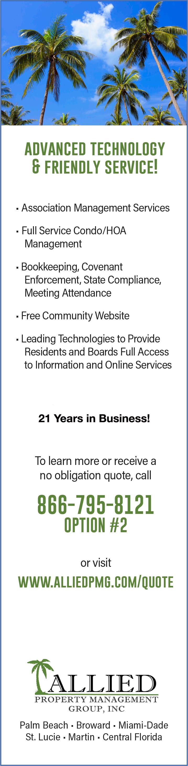 Group is a full-service property management firm providing service throughout Florida since 2003. Allied excels in assisting boards of directors in addressing all of their short- and long-term challenges. These challenges include routine matters as well as the unexpected. Routine challenges can include controlling expenditures, optimizing budgets, and increasing property values, all while enhancing the community experience;
