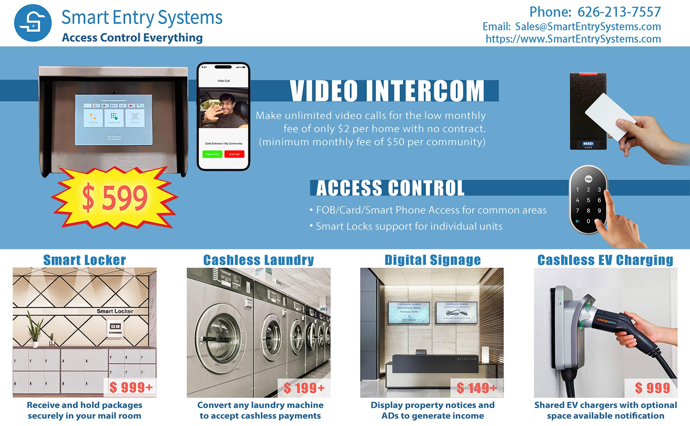 Smart Entry Systems: 626-213-7557; www.SmartEntrySystems.com; sales@SmartEntrySystems.com