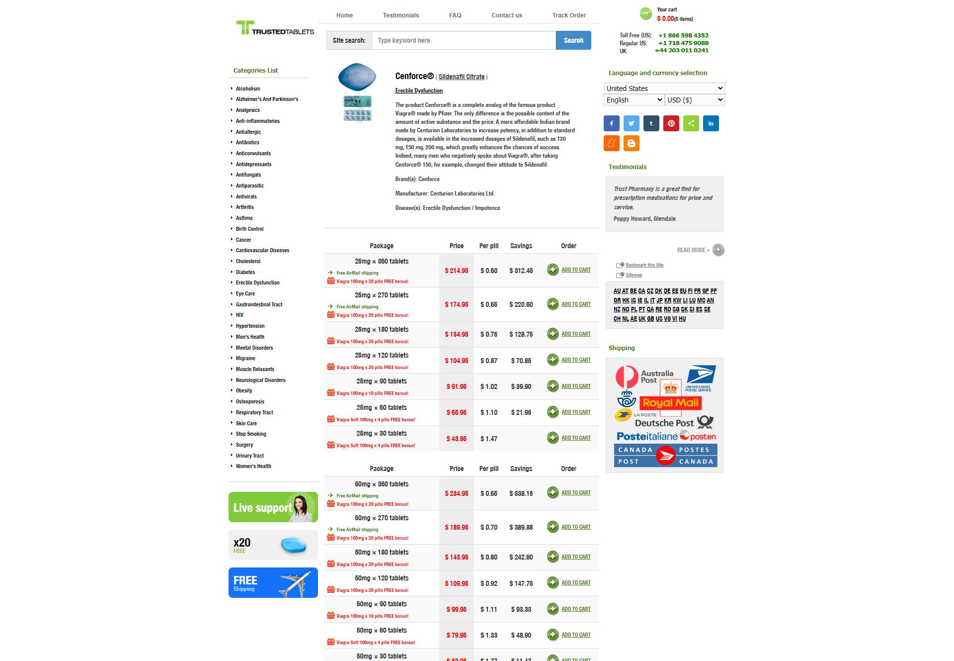 Trusted Tablets offers Cenforce, a complete analog of the well-known product Viagra by Pfizer. The main difference lies in the possible variation in the amount of active substance and the price. Cenforce is an affordable Indian brand manufactured by Centurion Laboratories, designed to enhance potency. In addition to standard dosages, Cenforce is available in increased dosages of Sildenafil, such as 120 mg, 150 mg, and 200 mg, which significantly improves the chances of success. Many men who had a negative opinion of Viagra reported a change in their attitude towards Sildenafil after trying Cenforce 150, for example. Trust Trusted Tablets to provide Cenforce® and other reliable medications for the effective treatment of erectile dysfunction and impotence.