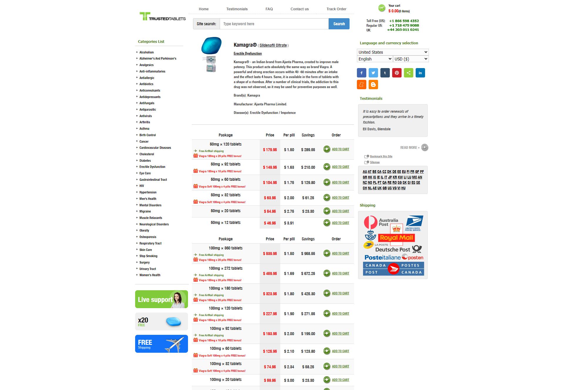 Trusted Tablets offers Kamagra, an Indian brand manufactured by Ajanta Pharma, designed to enhance male potency and treat erectile dysfunction (ED). Kamagra works in the same way as the renowned brand Viagra, providing a powerful and strong erection within 40-60 minutes after ingestion. The effect of Kamagra lasts for approximately 4 hours, allowing for a satisfying sexual experience. This medication is available in tablet form, shaped like a rhombus. Extensive clinical trials have shown no signs of addiction to Kamagra, making it suitable for both treatment and preventive purposes. Trust Trusted Tablets to provide Kamagra and other reliable medications for the effective treatment of erectile dysfunction and impotence.