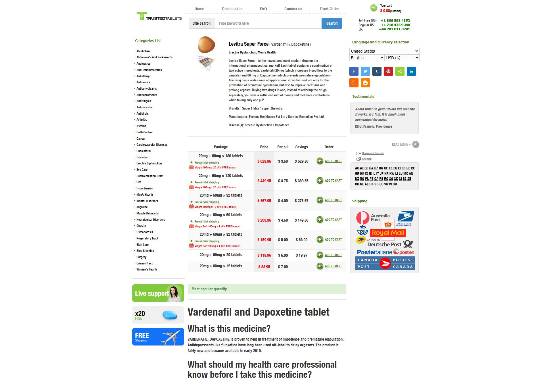 Introducing Levitra Super Force, the newest and most advanced drug available on the international pharmaceutical market. Each tablet contains a powerful combination of two active ingredients: Vardenafil 20 mg, which enhances blood flow to the genitals, and 60 mg of Dapoxetine, which effectively prevents premature ejaculation. This innovative medication offers a wide range of benefits, not only for preventing premature ejaculation but also for improving erections and prolonging orgasms. By purchasing two drugs in one, you not only save money but also enjoy the convenience of taking just one pill. Trust Super Filitra or Super Zhewitra from Fortune Healthcare Pvt Ltd or Sunrise Remedies Pvt. Ltd. to provide you with the ultimate solution for Erectile Dysfunction (ED) and men's health. Choose Levitra Super Force from Trusted Tablets for a comprehensive and efficient approach to ED treatment and enhancing your sexual experience.