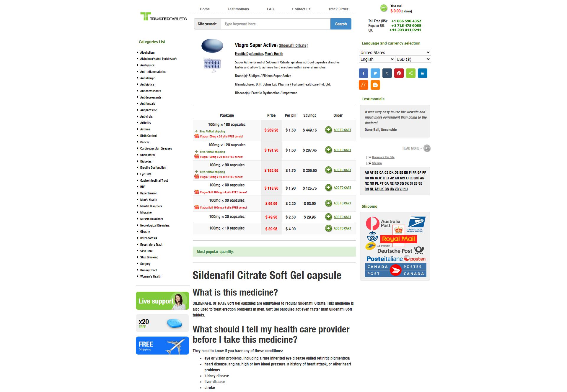 Trusted Tablets offers Viagra Super Active, a brand of Sildenafil Citrate specifically formulated in gelatine soft gel capsules. These capsules are designed to dissolve faster in the body, allowing for a quicker onset of action and the ability to achieve a hard erection within just a few minutes.