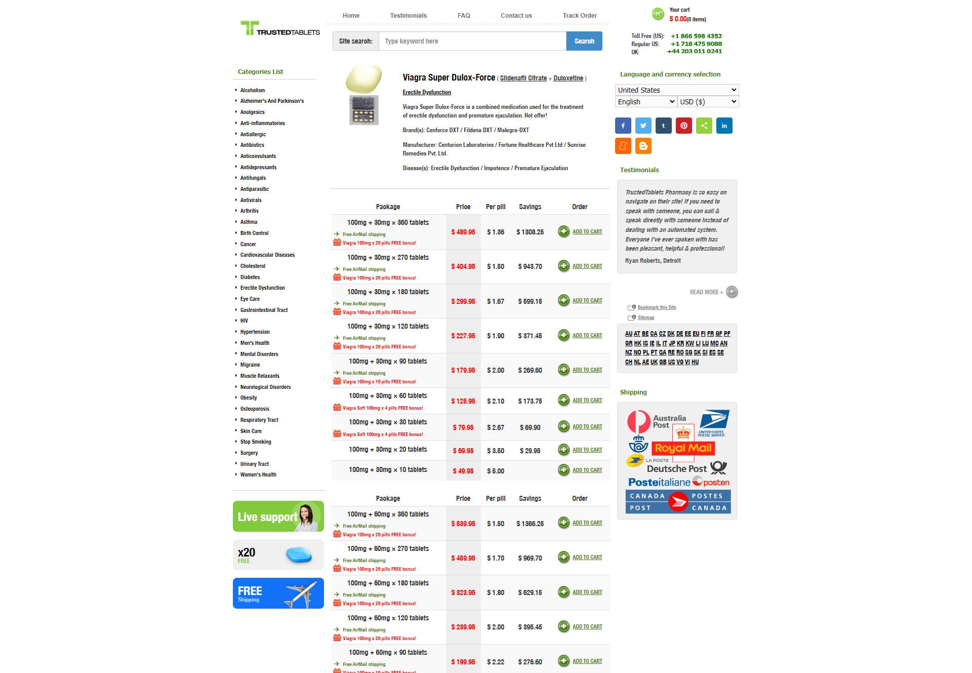 Viagra Super Dulox-Force, available at Trusted Tablets, is a combined medication that effectively treats both erectile dysfunction and premature ejaculation. This powerful formulation contains two active ingredients: Sildenafil Citrate and Duloxetine.