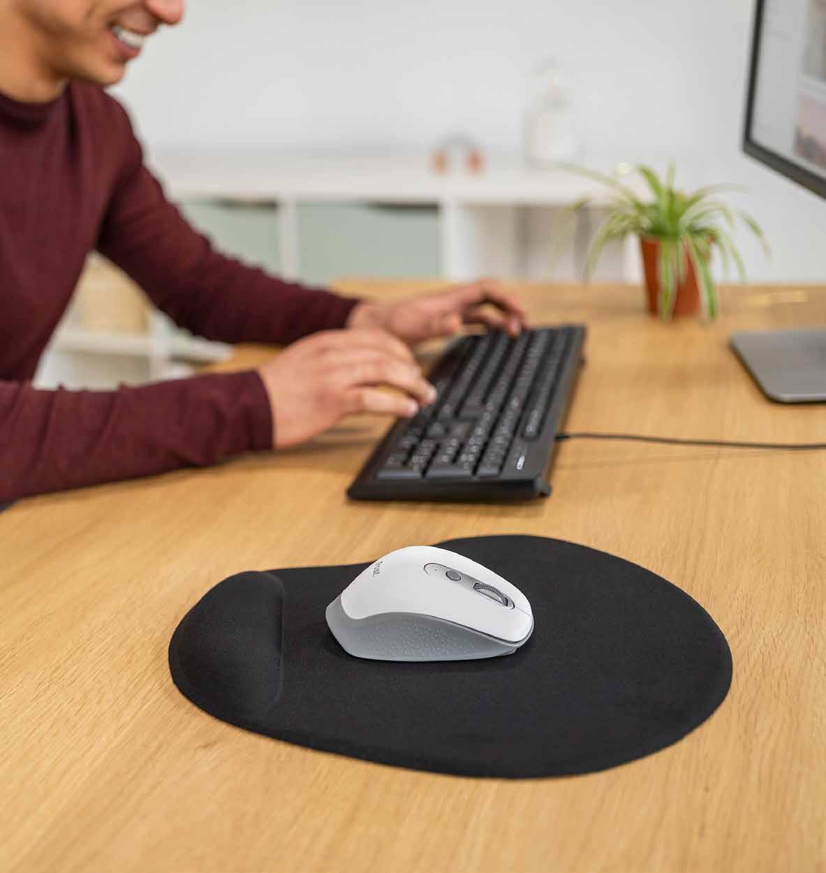 Mouse de forma curva, diseñado para ofrecer comodidad y control durante todo el día, fabricado con un 85 % de material reciclado.