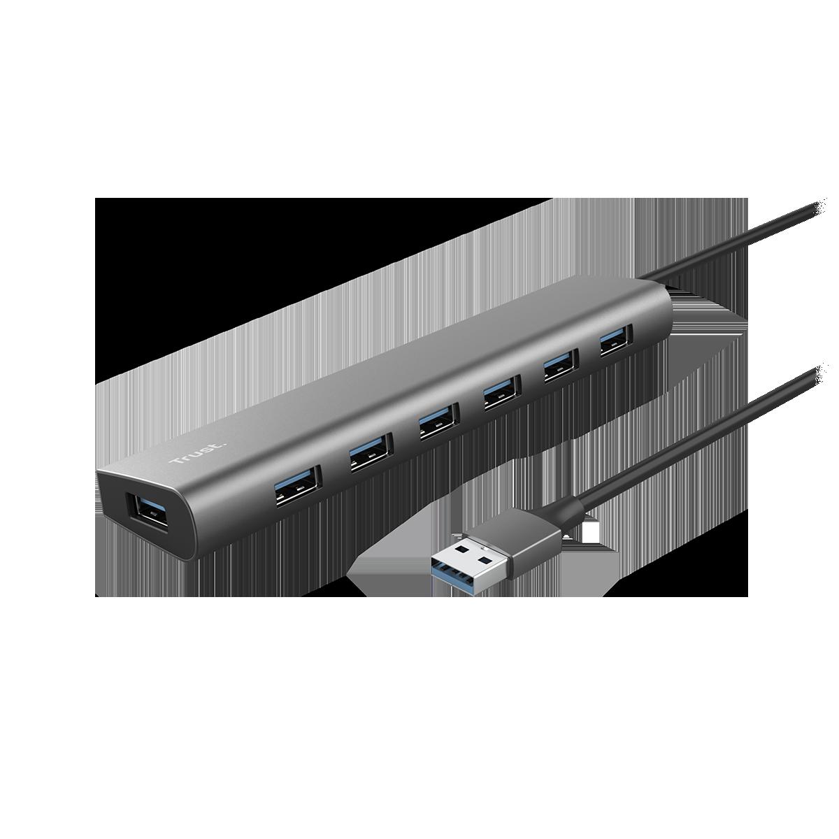 Hub USB elegante de alumínio que adiciona 7 portas USB-A extras com velocidade de 5 Gbps ao computador.