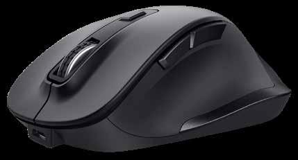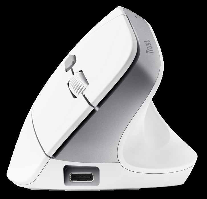 Mouse ergonômico com ângulo vertical ideal que reduz a tensão no punho, feito com 50% de material reciclado.