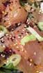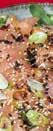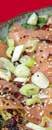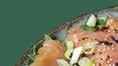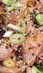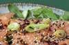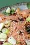 Meng alle ingrediënten voor de dressing en zet apart.Leg op een groot bord de rucola. Verdeel daaroverheen de komkommer en avocado. Scheur de zalm in grote stukken en verdeel over de salade. Drizzle er de dressing overheen. Bestrooi met de bosui en sesamzaadjes. Eet smakelijk!