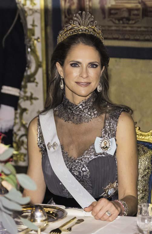 Om alle aandacht naar de zeer zeldzame, lichtblauwe diamant te laten uitgaan, is dezelfde kleur ook subtiel verwerkt in Máxima’s donkerblauwe japon van Jan Taminiau...