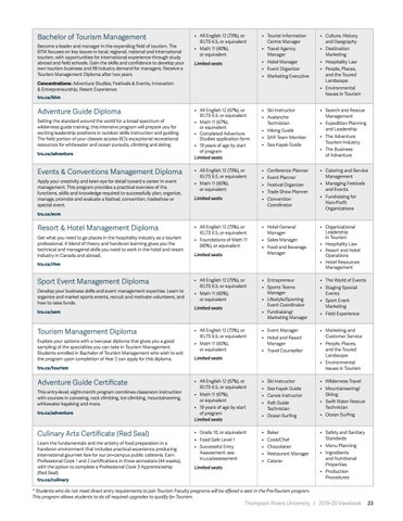 tru.ca/culinary * Students who do not meet direct entry requirements to join Tourism Faculty programs will be offered a seat in the Pre-Tourism program. This program allows students to do all required upgrades to qualify for Tourism.