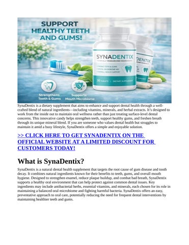 SynaDentix combines a scientifically balanced formulation designed to restore and maintain complete oral wellness. With 14 meticulously chosen ingredients, it helps strengthen teeth, rejuvenate gums, and support a healthy oral microbiome for long-term results. Supported by research and countless satisfied users, SynaDentix has earned its place as a safe, natural, and effective choice for improving dental hygiene, freshening breath, and enhancing overall mouth health. Whether you aim to resolve ongoing dental issues or simply wish to preserve your oral health for years to come, SynaDentix provides a proven, dependable path forward. Take the first step toward a cleaner, healthier, and more confident smile with SynaDentix today.