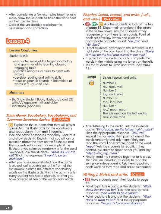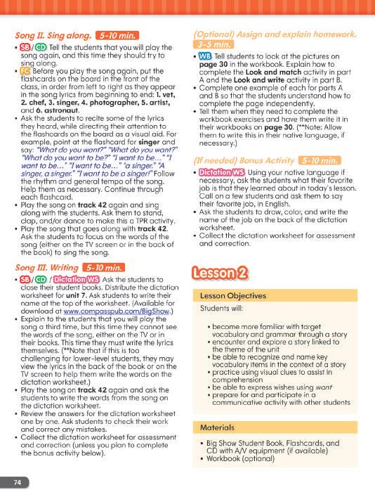 • Big Show Student Book, Flashcards, CD with A/V equipment (if available), and dictation worksheet
