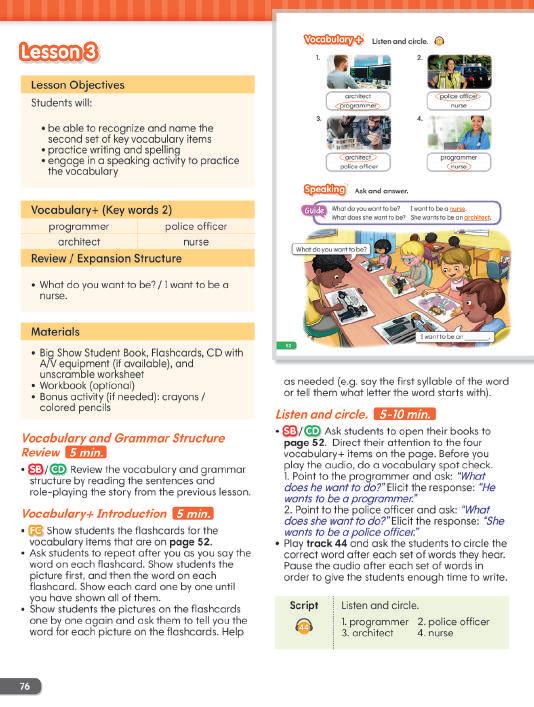 Lower level: Ask students for more information after checking the answer. Say: “Number one,” and have the students respond: “singer.” Say: “Whatdoyouwantto be?” and have the students respond: “I want tobeasinger.” Continue for each word.