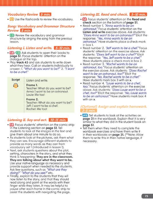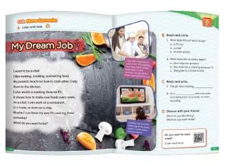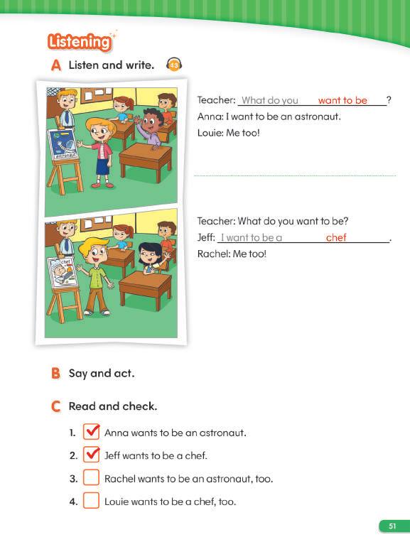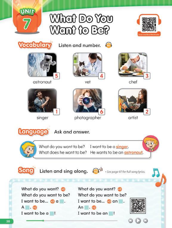 • SB Ask students to focus on the “Language” section of the page. Read the examples in the book together as a class to highlight the grammar structure: “Whatdoyouwanttobe?” “Iwanttobeasinger.”/ “What does he want to be?” “He wants to be an astronaut.”
