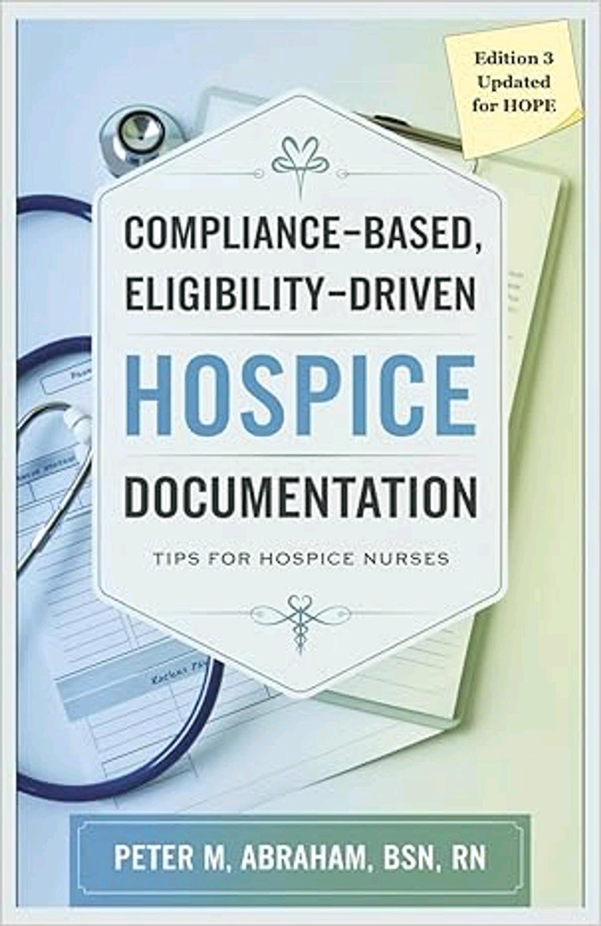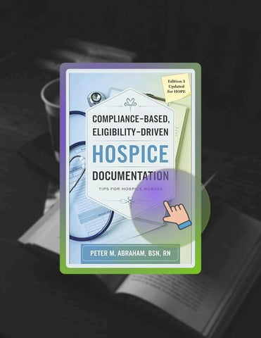 Get full-text version 'Compliance-based, Eligibility Driven Hospice Documentation: Tips for Hospice Nurses (Empowering Excellence in Hospice: A Nurse's Toolkit for Best Practices)' by Peter M Abraham. It’s a complete reading experience that’s designed for multi-platform reading. Start reading today to download this book in full in seconds..