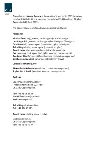 Copenhagen Literary Agency is the result of a merger in 2015 between Leonhardt & Høier Literary Agency (established 1951) and Lars Ringhof Agency (established 2001). The agency represents Scandinavian authors worldwide. Personnel: Monica Gram (mg), owner, senior agent (translation rights) Lars Ringhof (lr), owner, senior agent (Danish rights, film rights) Esthi Kunz (ek), senior agent (translation rights, sub rights) Åsfrid Hegdal (åh), senior agent (translation rights) Anneli Høier (ah), associated agent (translation rights) Eva Haagerup (eh), agent (sub rights, contract management) Ane Lauenblad (al), agent (Danish rights, contract management) Stephanie Andén (sa), junior agent (maternity leave) Celeste Meersohn (CFO) Alexander Buk-Swienty (assistant, contract management) Sophia Hersi Smith (assistant, contract management) Address: Copenhagen Literary Agency Frederiksholms Kanal 2, 3. floor DK-1220 Copenhagen K Tel.: +45 33 13 25 23 E-mail: firstname@cphla.dk Web: www.cphla.dk Åsfrid Hegdal (Oslo office) Tel.: +47 924 46 123 Anneli Høier (visiting address only): Studiestræde 35 A DK-1455 Copenhagen K Tel.: +45 51 51 50 37