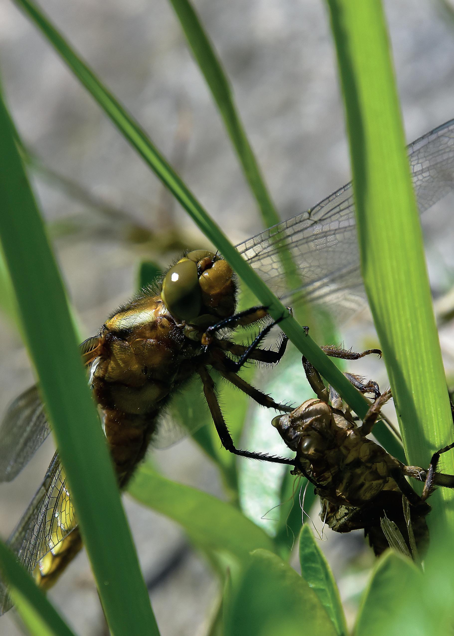 Forsidefoto (Rune Søndergaard): Guldsmed der er klækket fra sin nymfehud. De vandlevende rovlarver lever 2-6 år, før de forvandler sig til voksne insekter, der typisk kun lever i ca. 4 uger, hvor de spiser, parrer sig og lægger æg.