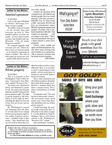 taken from them in a free society. Otherwise there is no incentive to excel, to start businesses, hire people, actively participate in commerce and overall improve To the Editor: This is in response to Don the lot of everyone. This is why communism and Weathington’s Sept. 9, 2011 column “Conversation from Bird- all totalitarian regimes ultimately land” entitled “Resources 101.” fail in that all the people are reOur nation was conceived in duced to a situation where they liberty and dedicated to justice share a common misery. This is for all. Our nation thus founded where redistribution of wealth jealously guarded and protected leads. As it has been said, “You soon private property rights. The right to private property is the foun- run out of other people’s money.” dation of every right we have, The government cannot spend including the right to be free and money more wisely than those should free use of their to havearefree use of one’s private ourwho reading this ad confirms claim to behave a closely-read private property. property. newspaper – and illustrates the old motto multum in parvo would encourage the readMr.– much Weathington’s in little. Thenotions next time youI have something to sell, remember have the quickest, suresters andtomost to 14, takewelcome a look at way the Sept. and surmisings the effect reach buyers through their favorite newspaper. 2011 letter to the editor on pages to severely limit ifisnot outright 8 - 9 of the Bulletin by Stuart R. destroy private property rights inDaily The Tryon Bulletin Goldstein. our country. A person’s posseswww.tryondailybulletin.comThis is a well-written sions – included in this is their rebuttal to Mr. Weathington’s money – they should have free “Resources 101” column. – Howard Brittain, Columbus. use of it with no threat that it be
