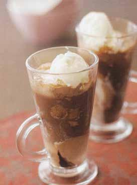 Put 1 scoop of coconut ice cream into each of 4 heatproof glasses, top with a scoop of chocolate ice cream, then repeat the layers.