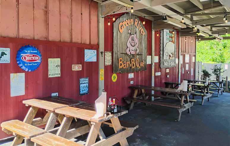 able to reopen on April 1st, which is the same day Melanie opened Green River Barbeque for the first time in 1984. “There was concern in the community that we would just cut and run and say it’s too much— too expensive—to rebuild,” shares Tom. “For us, this is where we want to be for the rest of our lives. We want to be in Saluda. We want this restaurant. Our reasons for wanting our restaurant to be open haven’t changed just because there was a mudslide and a hurricane.” And people are certainly happy they did not “cut and run.” Many of their original employees—some