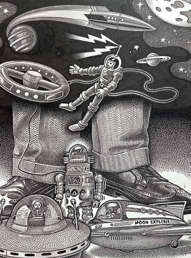 This month, we visit with an iconic illustrator, Kevin Sprouls. When Kevin isn’t playing drums in a local rock band or bustin’ out the bagpipes for the annual St. Patrick’s Day Parade in Tryon, he is putting pen to paper as a prolific artist. Known as the creator of a distinctive art style he began using at the Wall Street Journal in the late Seventies, Kevin continues to work as a freelance illustrator.