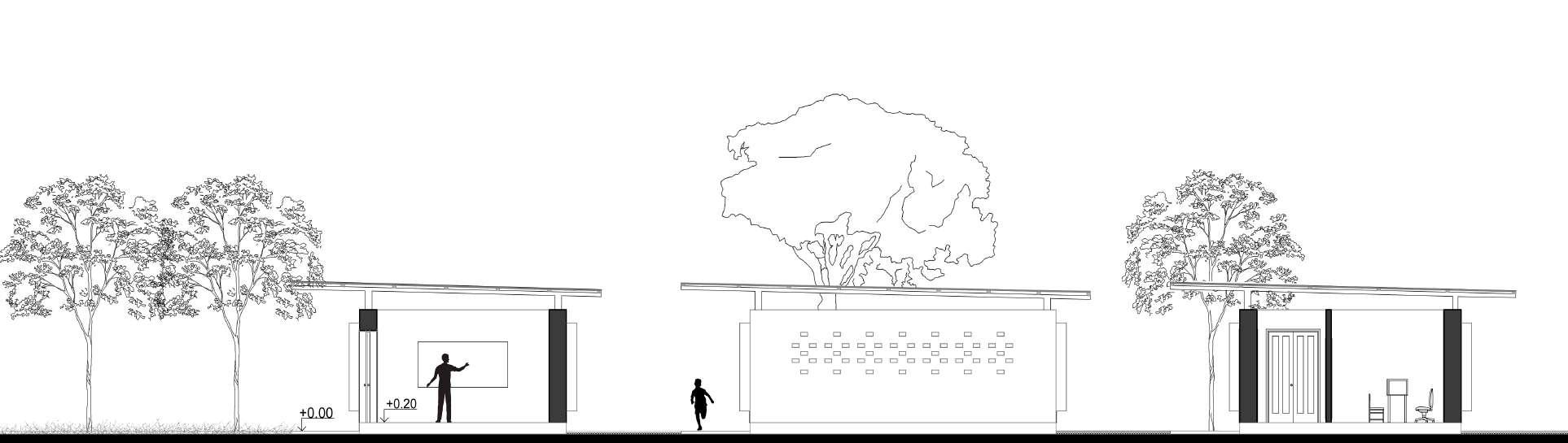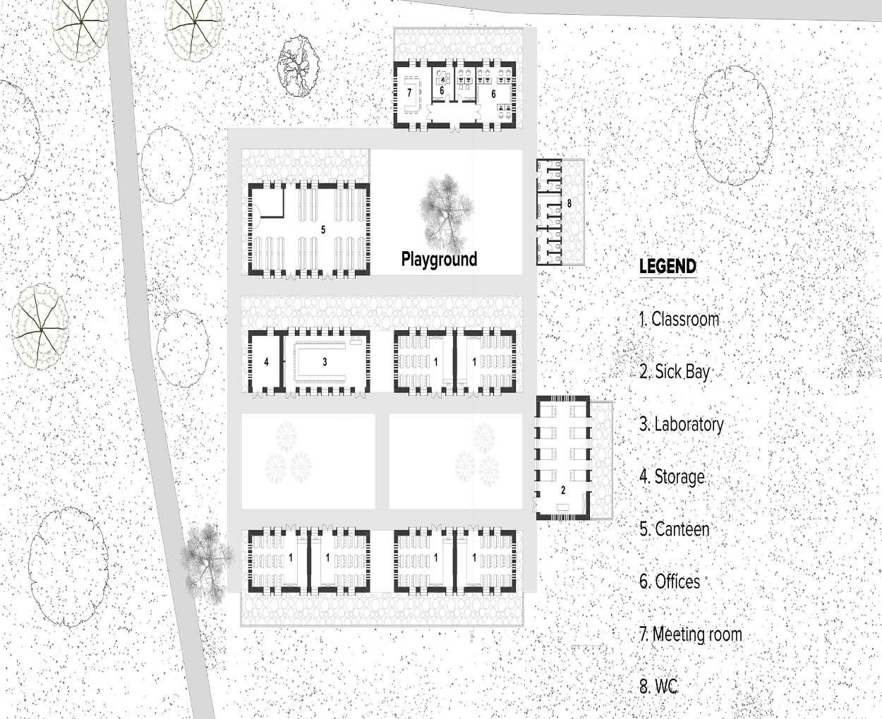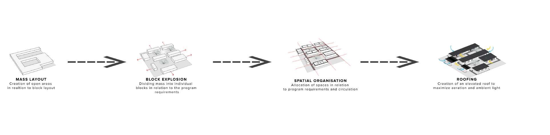 Spatially, the building blocks have been hierarchically arranged around courtyards, creating a seamless merge of the interior to the exterior, while still providing the students an ambiance to study and play. The open spaces allow a heavy influx of natural light due to the favorable climatic conditions. To demonstrate the fluidity and freedom of the region, transitions from one block to the other is free flowing due to the linked pavement connecting all the blocks.