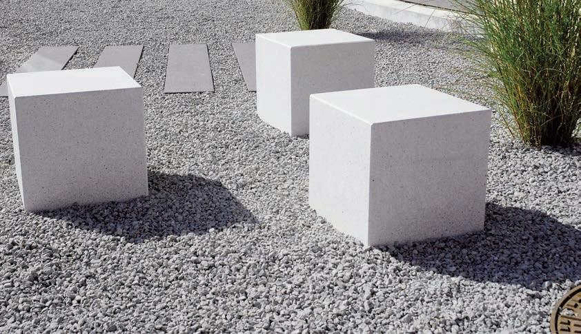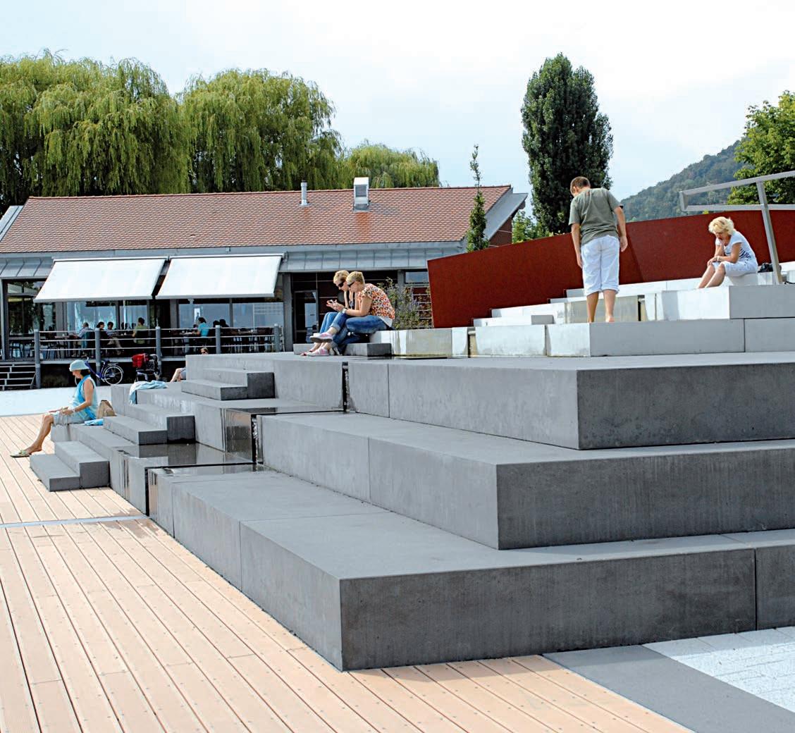 Sonderteile ConceptDesign (Maßfertigung) – Betonquader für Unterbau, Quader für Treppenstufen, Quader für Sitzbank, Sitzwürfel. Brunnen: Ausführungen in Beton C30/37, 0-8 mm Korn, grau und anthrazit eingefärbter Sichtbeton, glatt.