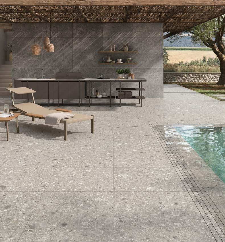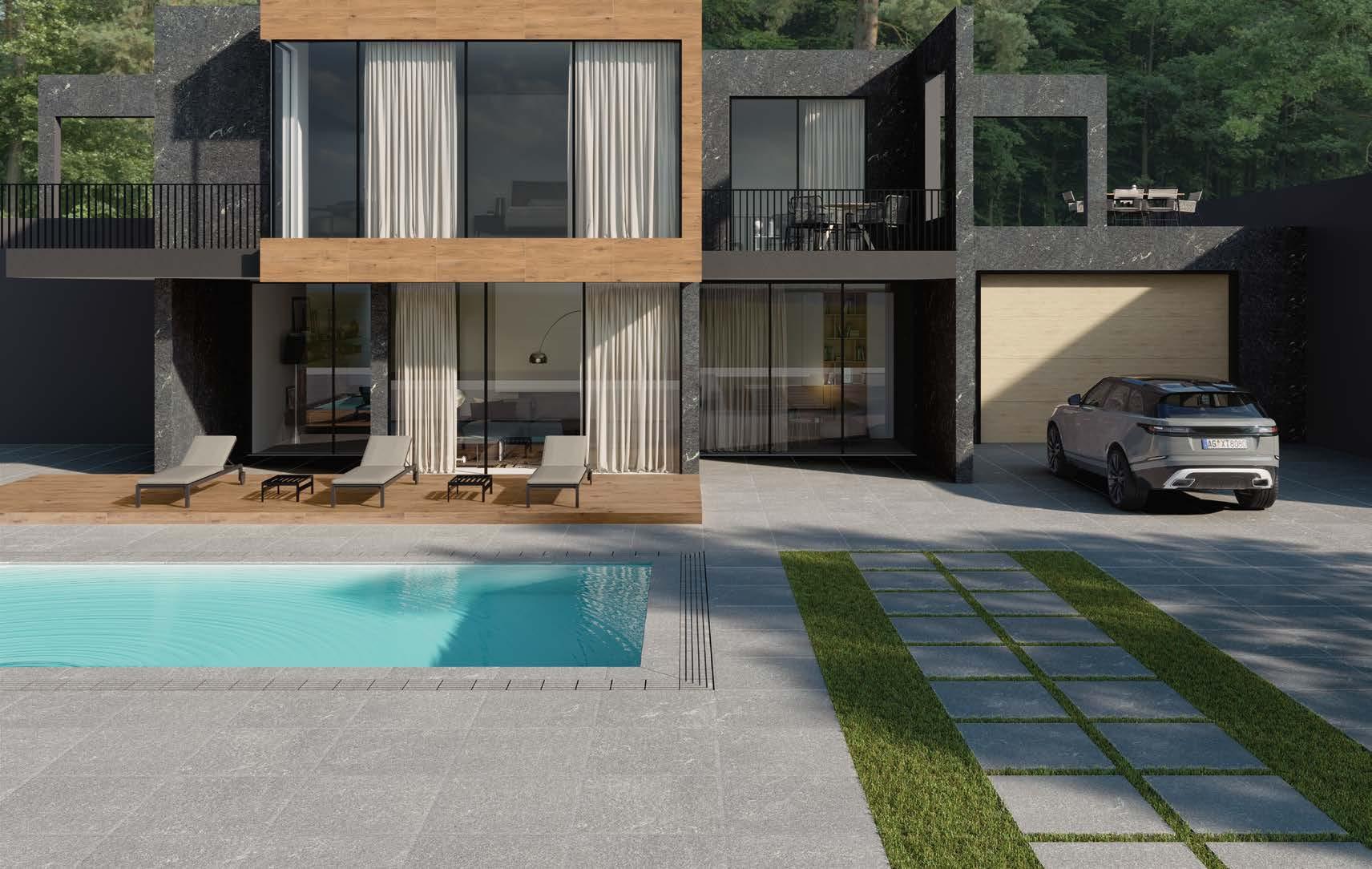 PISCINA E DINTORNI: LA GAMMA AEXTRA20 COMPRENDE DIVERSI BORDI VASCA E GRIGLIE , OLTRE A UN’AMPIA SCELTA DI EFFETTI, FORMATI E MODALITÀ DI POSA PER COMPLETARE IL PROGETTO OUTDOOR.