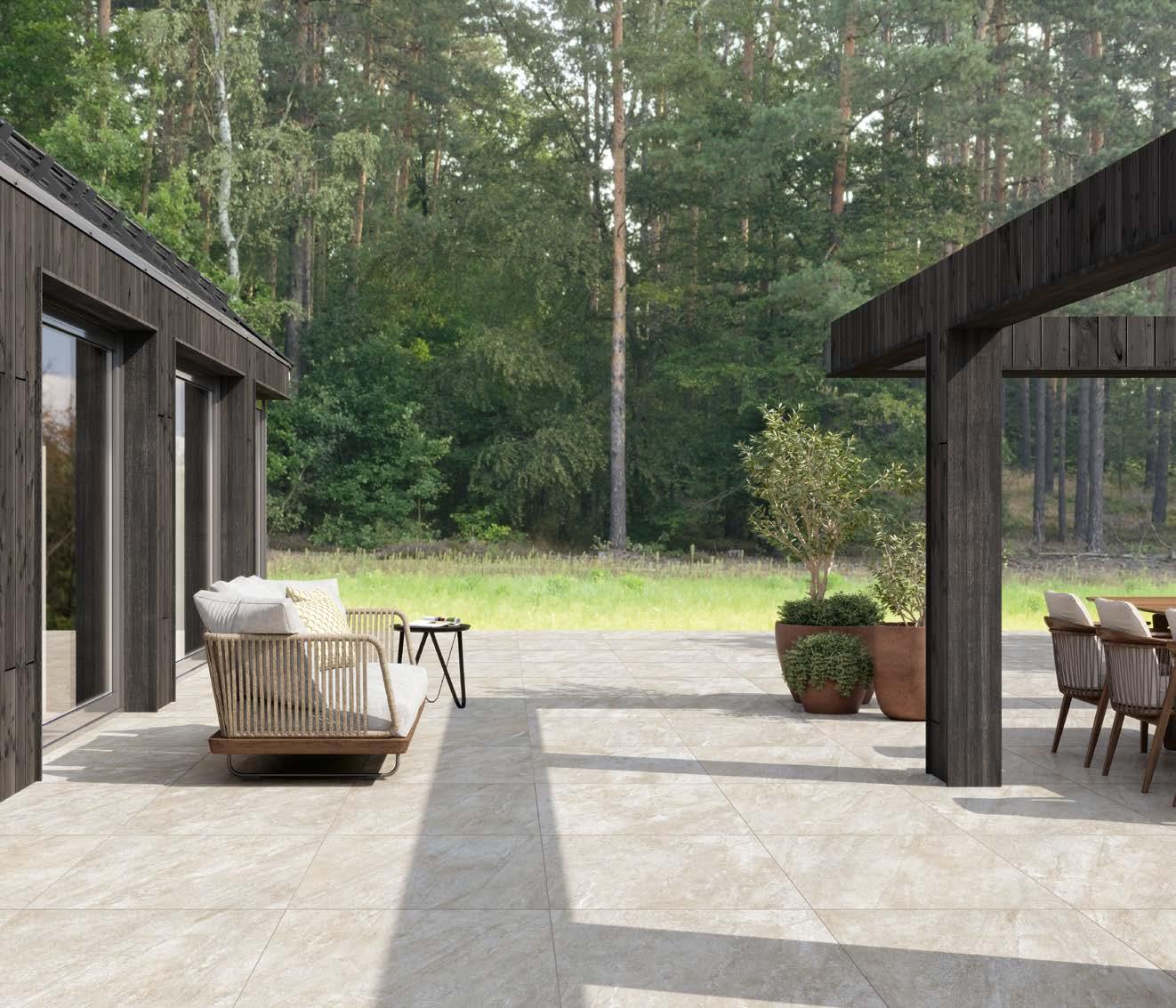 Le format de 80x80 de la ligne Aextra20 de Caesar, en grès cérame avec épaisseur majorée, apporte un vent de fraîcheur au design de la vie en plein air.