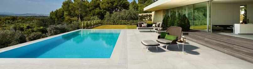 Im Wasser wie am Beckenrand: viele Möglichkeiten für einen eleganten, freien Stil Ohne auf die überragenden Leistungen zu verzichten, die nur mit Feinsteinzeug möglich sind.