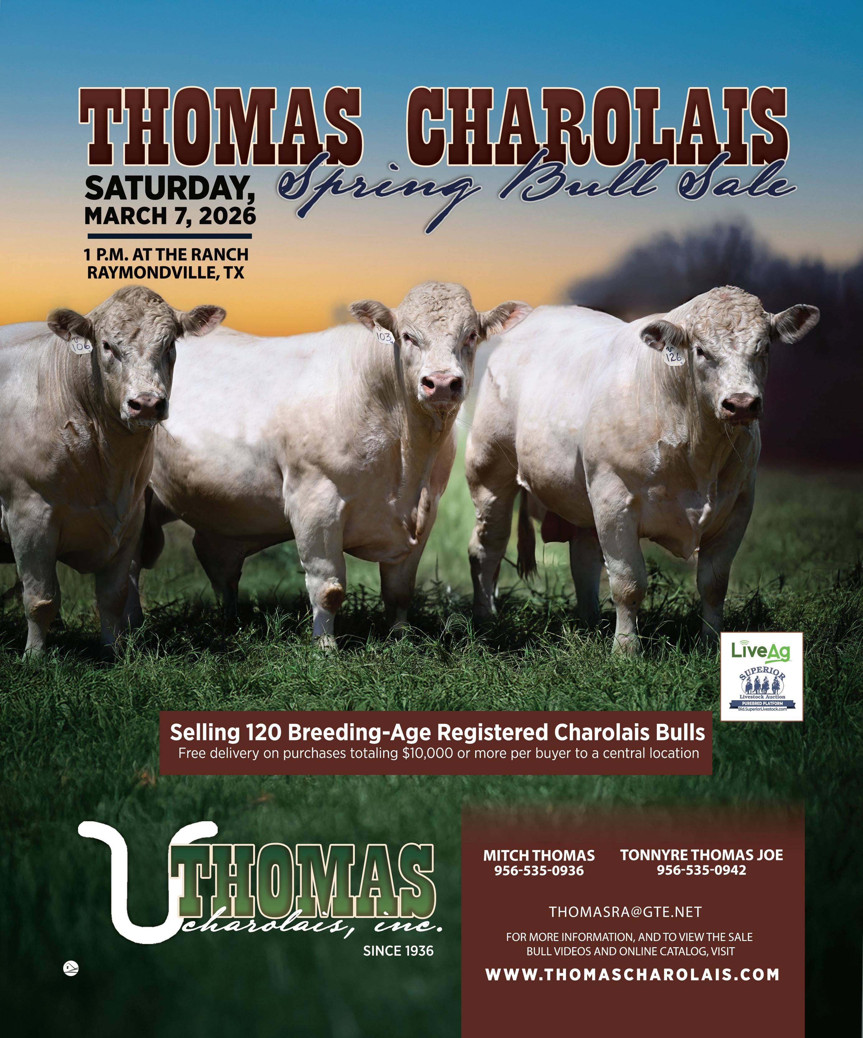 Thomas Charolais: Spring Bull Sale Where: Raymondville When: 1 p.m.