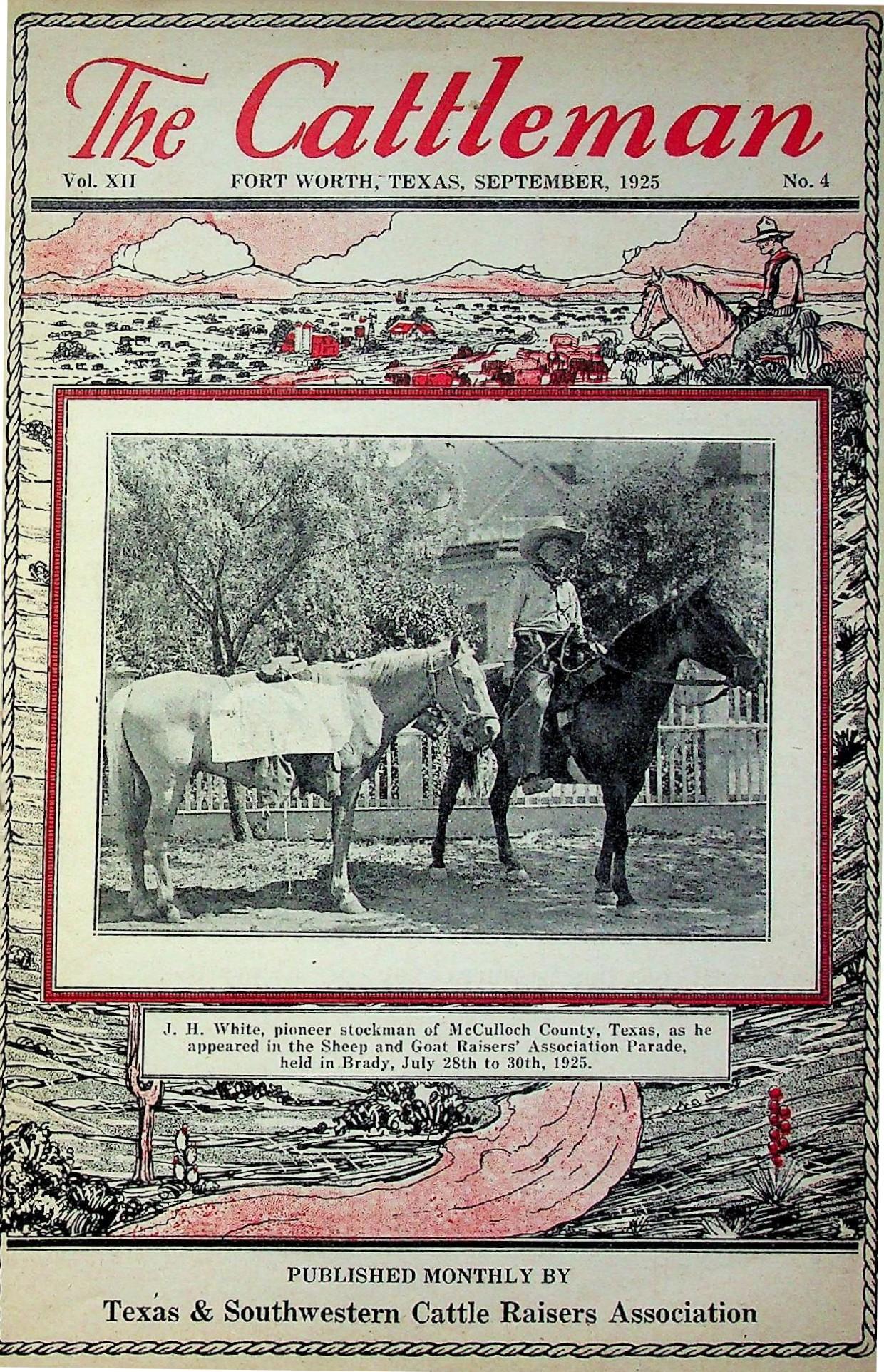 On the cover is J.H. White, a pioneer stockman of McCulloch County, as he appeared in the Sheep and Goat Raisers’ Association Parade held in Brady July 28-30, 1925.