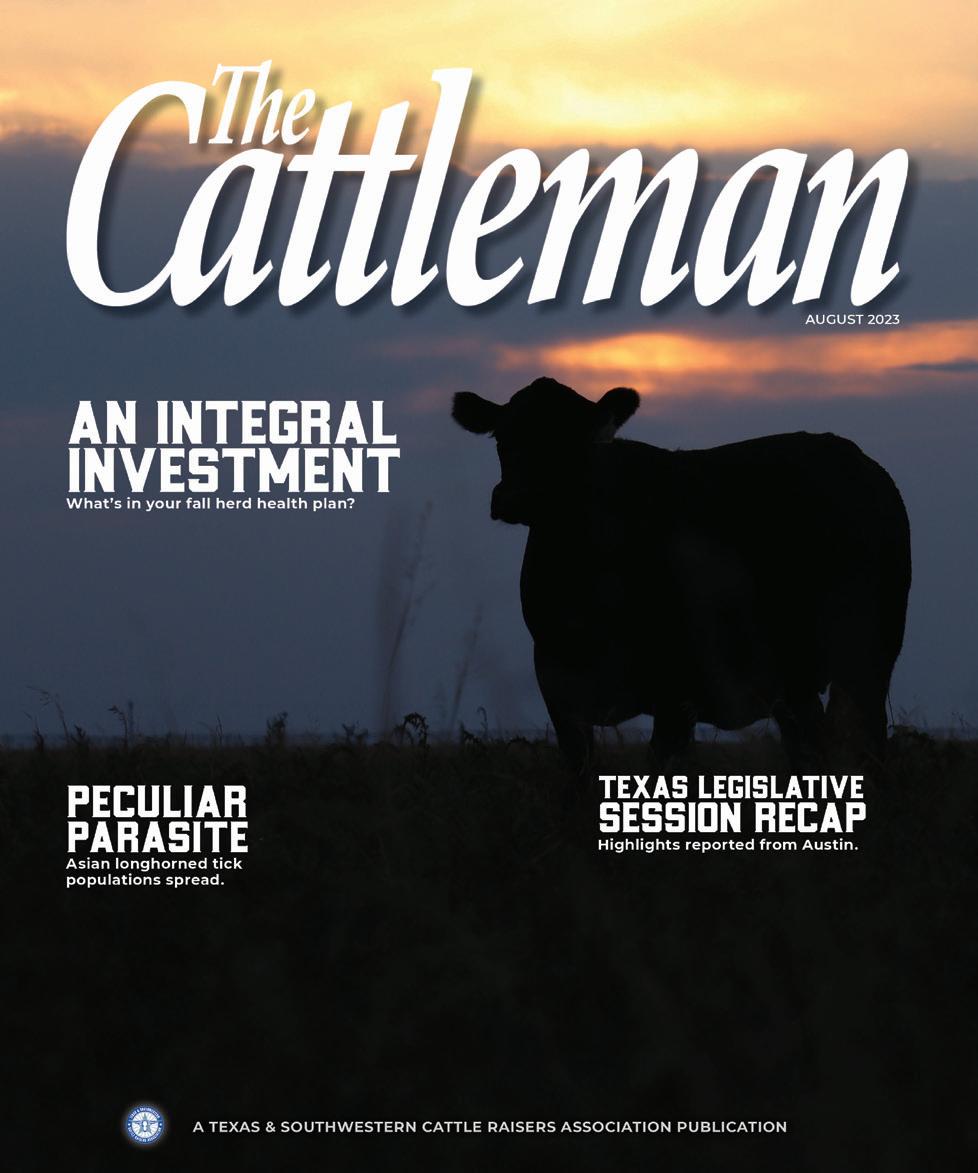 Beyond the traditional realm of animal health, this issue of The Cattleman also recounts how ranchers, landowners and wildlife managers fared during the Texas Legislature’s 88th Regular Session. In many ways, the health of cattle-related politics reflects our freedom to operate. Analyze the most recent policy wins for Texas & Southwestern Cattle Raisers Association on page 26. As always, we hope you enjoy this latest issue and learn something new from its pages. Thank you to our many contributors and supporters! T C