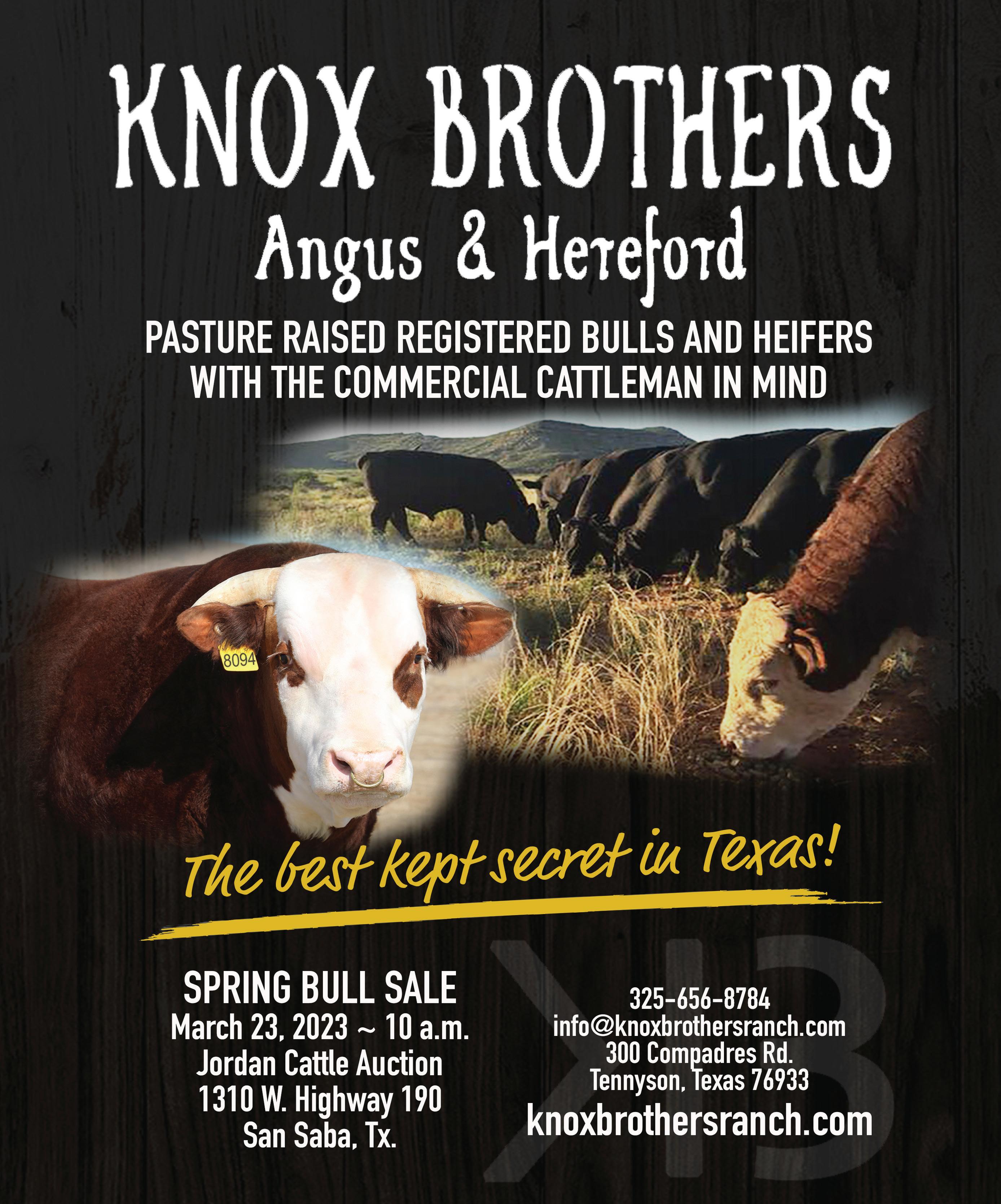 TOP QUALITY BEEF-TYPE AMERICAN BRAHMAN BULLS AVAILABLE AT J.D. HUDGINS RANCH Thick muscled, good bone, with eye appeal and light birth weights. Give us a call for all your Brahman needs. We invite you to drop by the ranch and inspect these bulls at anytime. FOR MORE INFORMATION Hungerford, Texas 77448 Office: 979-532-1352 • FAX: 979-532-2825 email: manso@jdhudgins.com Visit our website at www.jdhudgins.com Get the maximum hybrid vigor With J.D. Hudgins Brahman Bulls We welcome you ... our gates are always open. February 2023 tscra.org | 9 The Cattleman