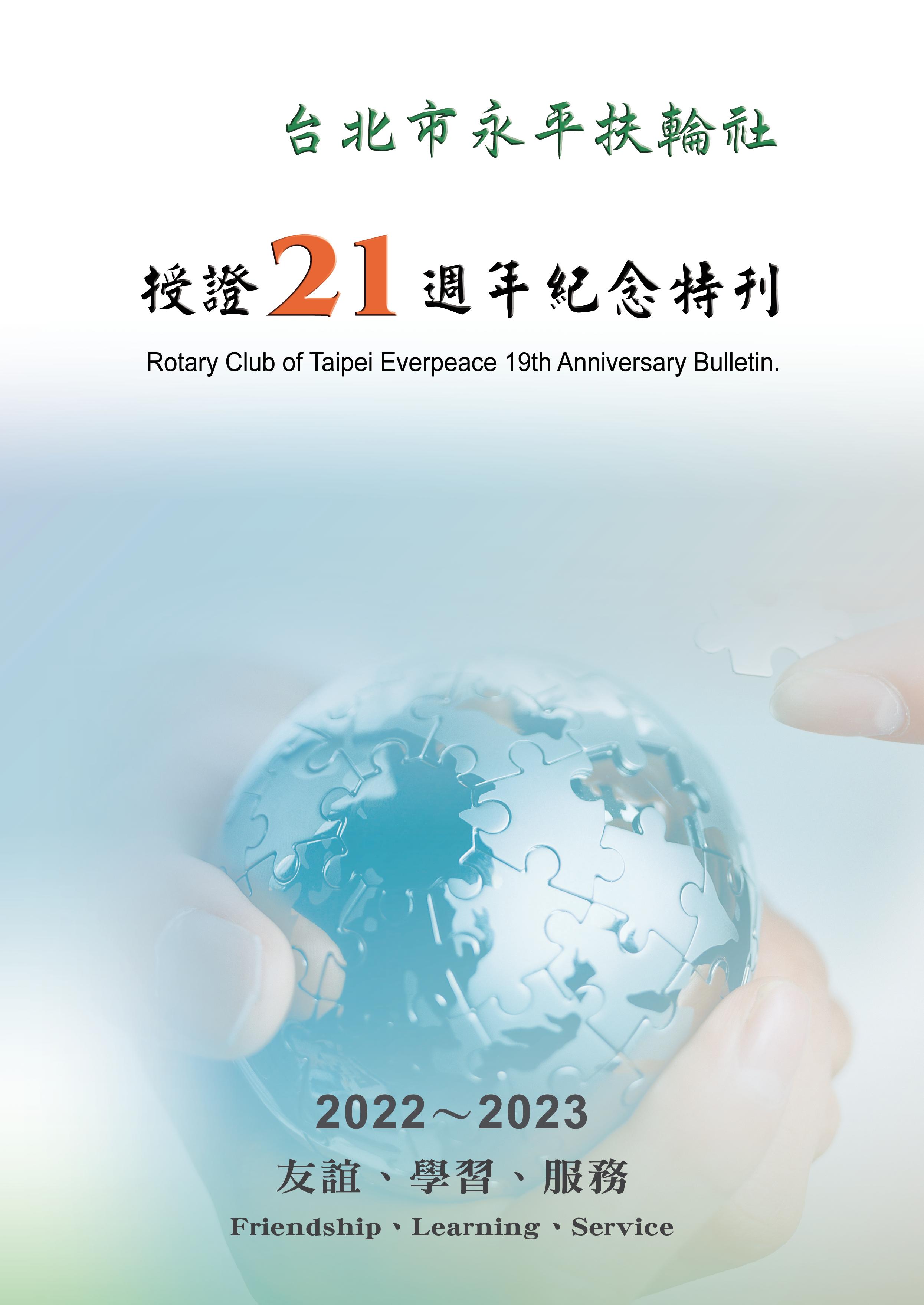 21年在人生的旅途中不算一個短的日子,就個人來講也是一個世代的時間, 是一個特別要來感恩以及傳承和轉折的時期。相對於今年地區扶輪的口號「扶輪傳 承,世代共好」更有其意義。當然飲水思源,我們要感謝母社和平社在二十一年前 輔導成立了永平社,成為扶輪大家庭的一份子,並由我們和平社的CP insurance 林明憲先生擔任創社時總監特別代表。