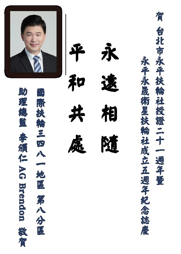 今天是台北市永平扶輪社授證21週年暨永平永晟衛星扶輪社成立5週年 的紀念典禮,Charlies謹代表台北市和平扶輪社全體社友向貴社致上最 誠摯的祝福。
