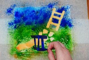 Cut out the ladder and the silhouette of Yaakov. Using double sided tape, stick them onto the canvas.