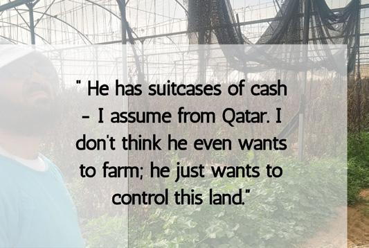It wasn’t until the last day - mere hours before my flight - when I was speaking to a farmer who had suffered immeasurable losses. He told me, “My neighbor, an Israeli Arab, keeps offering to buy me out. He knows I’m drowning. He has suitcases of cash - I assume from Qatar. I don’t think he even wants to farm; he just wants to control this land. They all do.”